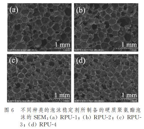 泡沫穩(wěn)定劑的存在對于硬質聚氨酯泡沫性能影響在宏觀上有著十分顯著的體現。圖5是添加不同種類的泡沫穩(wěn)定劑后制樣得到的硬質聚氨酯泡沫橫截面的數碼照片。結果表明,接枝APEG鏈段的PAVE-5和PGVF-6泡沫穩(wěn)定劑所制備的聚氨酯泡沫RPU-3和RPU-4,其泡孔結構相較于市售產品所制備的聚氨酯泡沫展現出了更加細膩均勻的泡孔結構,而市售產品所形成的泡沫則表現出較為粗糙且孔徑不均勻的泡孔結構。這表明親水結構有利于泡沫穩(wěn)定劑均勻分散在多元醇中并使得反應充分進行,泡孔尺寸細小致密,有利于改善硬質聚氨酯泡沫的壓縮性能。