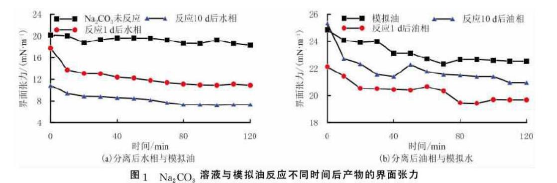 在Na2CO3溶液與模擬油反應(yīng)1d和10d后,分離得到的水相及油相分別與模擬油及模擬水間的界面張力隨測定時(shí)間關(guān)系見圖1.由圖1(a)可以看出,Na2CO3溶液和模擬油反應(yīng)1d及10d后分離出的水相與模擬油的界面張力,比未反應(yīng)Na2CO3溶液與模擬油的界面張力低,且隨著反應(yīng)時(shí)間增加,水相與模擬油的界面張力降低。這說明模擬油中酸性物質(zhì)與Na2CO3溶液反應(yīng)生成的部分界面活性物質(zhì)具有較好的水溶性。水溶性的界面活性物質(zhì)在油水界面處吸附,使分離出的水相與模擬油界面張力降低;隨著反應(yīng)時(shí)間的增加,所生成的界面活性物質(zhì)增多,分離出的水相與模擬油的界面張力降低幅度增大。