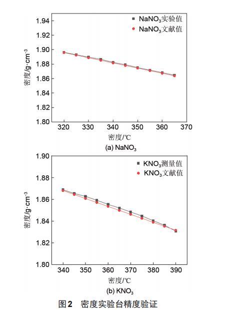 密度實(shí)驗(yàn)臺精度驗(yàn)證如圖2所示。密度實(shí)驗(yàn)臺測得NaNO_3、KNO_3的密度與參考文獻(xiàn)上給出的密度值變化趨于一致,并且最大偏差值低于0.12%,考慮到文獻(xiàn)值存在的誤差,本實(shí)驗(yàn)臺的密度測量精度滿足實(shí)驗(yàn)要求。