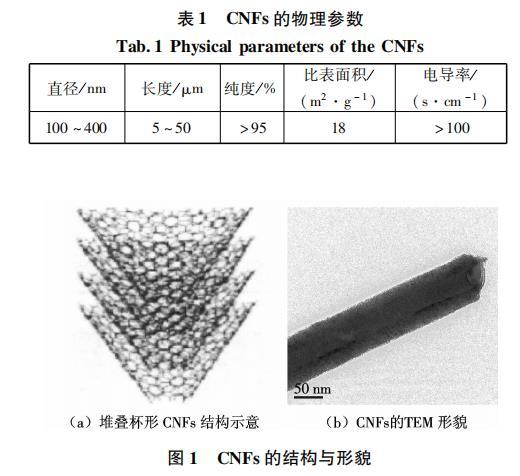 納米碳纖維(carbon nanofibers,CNFs)是近十年興起的一種新型亞微米增強(qiáng)纖維材料,它是化學(xué)氣相生長碳纖維的一種形式,一般通過裂解氣相碳?xì)浠衔镏苽?,是?gòu)成以碳黑、富勒烯、單壁和多壁碳納米管為一端,以連續(xù)碳纖維為另一端鏈節(jié)中的一環(huán).CNFs的直徑一般在150~400nm之間,與碳納米管(CNTs)相比,CNFs的制備更易于實(shí)現(xiàn)工業(yè)化生產(chǎn).CNFs有著優(yōu)異的物理性能、力學(xué)性能和化學(xué)性能.研究表明,CNFs的抗拉強(qiáng)度可以達(dá)到2~5 GPa,平均彈性模量為300 GPa.除具有普通氣相生長碳纖維的特性,如低密度、高比模量、高比強(qiáng)度、高導(dǎo)電性等性能外,CNFs還具有缺陷數(shù)量少、比表面積大、結(jié)構(gòu)致密等優(yōu)點(diǎn),這使得CNFs在納米復(fù)合材料領(lǐng)域得到了廣泛的應(yīng)用.然而,納米復(fù)合材料的性能往往會(huì)受到兩個(gè)主要因素的影響,一個(gè)是納米材料在基體材料中的分散程度,另一個(gè)是納米材料表面與基體材料之間的黏結(jié)強(qiáng)度和能量.由于受到范德華力的的影響,CNFs彼此吸引并相互纏結(jié)在一起,懸浮于水的表面,幾乎無法均勻溶解,這大大制約了CNFs在復(fù)合材料中的應(yīng)用.如何解決CNFs在水性體系中的分散已成為研究者廣泛關(guān)注的熱點(diǎn).
