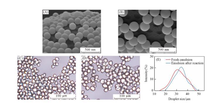 利用Pickering乳液進行選擇性修飾是一種比較常用的Janus顆粒制備方法。由于裸露的SiO?顆粒偏親水,在Pickering乳液液滴表面的SiO?顆粒僅包裹了少量石蠟[圖1(A)和(B)]。這為使用一種Pickering乳液制備兩種具有不同氟碳鏈與碳氫鏈覆蓋面積比例的Janus顆粒提供了可能。