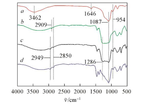 圖2為SiO?顆粒改性前后的紅外光譜圖。在裸露的SiO?顆粒(圖2譜線a)上,3459 cm?1處出現(xiàn)羥基的氫氧鍵伸縮振動吸收峰,1646 cm?1處是納米SiO?表面吸附水的氫氧鍵振動吸收峰,而在改性的顆粒上這2處吸收峰強度有所降低甚至消失,這是由于SiO?顆粒表面的硅羥基(Si—OH)與硅烷偶聯(lián)劑發(fā)生縮合反應而數(shù)量減少,并且改變了顆粒表面與水之間氫鍵的鍵合密度;在圖2譜線b~d中,2949處和2850 cm?1處的吸收峰可分別歸屬為甲基和亞甲基上的碳氫鍵伸縮振動;并且這些吸收峰強度增加,說明甲基和亞甲基數(shù)量增加。在1170~1286 cm?1間的峰為—CF?、—CF?的伸縮振動峰,由于—CF?、—CF?的伸縮振動峰與1087~1200 cm?1間的硅氧鍵伸縮振動吸收峰重合,從而導致圖2譜線b~d中1087~1286 cm?1間的吸收峰變寬,并且吸收峰強度依次減弱,說明—CF?、—CF?數(shù)量減少。綜上所述,可初步說明納米SiO?表面被不同比例的碳氫鏈和氟碳鏈覆蓋。