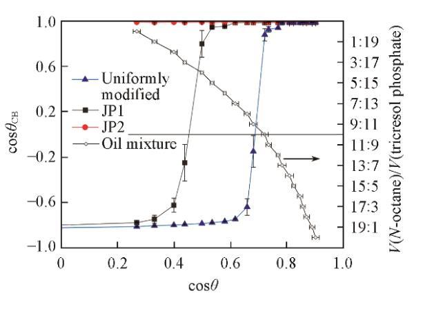 在不同油混合物的接觸角測(cè)量結(jié)果(圖4)中,用氟碳鏈覆蓋的光滑石英表面所測(cè)量的接觸角數(shù)據(jù)以cosθ表示,旋涂法測(cè)量的粗糙接觸角數(shù)據(jù)用cosθ_CB表示,用于研究平滑表面與粗糙表面對(duì)接觸角的影響。顆粒以旋涂法放置于基板上,形成了顆粒單層緊密排列的粗糙表面,使測(cè)量的接觸角偏離了顆粒表面材料所具有的接觸角。該接觸角的測(cè)量結(jié)果符合由Cassie-Baxter方程描述的復(fù)合表面,即具有凹入曲率的微結(jié)構(gòu)表面。另外,粗糙表面接觸角發(fā)生顯著變化時(shí),即cosθ_CB跨越0點(diǎn),對(duì)應(yīng)的cosθ值與顆粒表面材料相關(guān)。氟碳鏈覆蓋顆粒的面積越大,顆粒對(duì)具有較低表面張力的油相(即cosθ越大)顯示出疏油性(cosθ_CB > 0)。