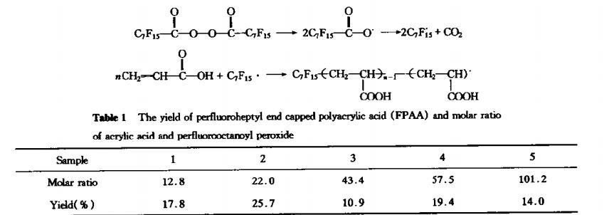 聚合反應(yīng)是在溶劑CF_{2}CICF CI_{2}中進(jìn)行的,大自由基將進(jìn)行鏈轉(zhuǎn)移,單基或雙基終止反應(yīng),從而得出產(chǎn)物。反應(yīng)步驟為在-17℃溫度下將50mL含有預(yù)定摩爾的全氟庚雙酰過(guò)氧化物的CF?CICFCI?溶液加入有氮?dú)獗Wo(hù)裝置的反應(yīng)器中,攪拌下加入已精制過(guò)的丙烯酸(密度1.0511g/mL),加熱并恒溫在45℃下反應(yīng)10h,產(chǎn)物通過(guò)甲醇-乙酸乙酯溶劑體系重結(jié)晶并置真空烘箱中干燥,稱重并計(jì)算產(chǎn)率(如表1)。