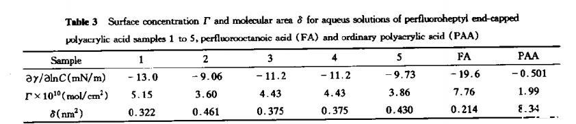 由表3可見(jiàn),聚丙烯酸(分子量2.5x10?)在水溶液中界面活性極低(數(shù)據(jù)引自文獻(xiàn)),每個(gè)PAA分子對(duì)空氣-水界面的覆蓋十分松散,全氟庚酸分子所占約0.21nm2,接近全氟烷烴緊密排列的分子軸截面積,而FPAA每個(gè)分子所占據(jù)的表面面積在0.32~0.46nm2之間,形成尾形鏈構(gòu)象的刷狀結(jié)構(gòu)。全氟端基的引入,顯著改變了PAA分子在界面的構(gòu)象,由于全氟烴的憎水特性,在水溶液中趨于向水空氣界面的吸附,從而極大的提高了界面活性,降低了界面能。