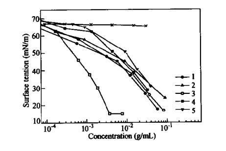 聚丙烯酸(PAA)是研究較多的合成聚電解質(zhì),其分子鏈在水溶液中離解而帶有大量羧酸陰離子,Ishimuro等較詳細(xì)研究了PAA水溶液的表面張力隨其離解度(PH值)及離子強(qiáng)度(NaCl濃度)的變化。根據(jù)含氟烴聚乙二醇的研究可知,全氟烴具有極強(qiáng)的憎水特性,當(dāng)它作為長(zhǎng)鏈分子的一個(gè)端基于水溶液中時(shí),鏈端趨向于向空氣-水界面的吸附,而長(zhǎng)鏈則由于與溶劑水的相互作用而在水中形成尾形鏈構(gòu)象。尤其在高表面濃度時(shí),形成十分特殊的刷狀高分子。從分子設(shè)計(jì)來(lái)看,若能合成出全氟烴端基聚丙烯酸,由于其端基的特殊結(jié)構(gòu),它將表現(xiàn)出完全不同于普通聚丙烯酸的界面吸附行為。