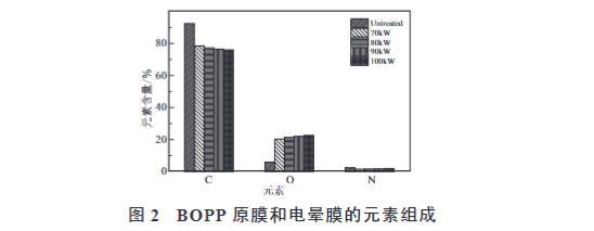 (2)電暈處理導(dǎo)致了BOPP薄膜的C含量顯著下降,O含量大幅增加,N含量輕微下降;隨著電暈功率的增加,BOPP薄膜表面與空氣的化學(xué)反應(yīng)更徹底,引起O和N含量增加,C含量下降。