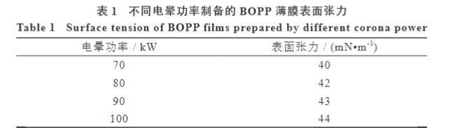 電暈功率的變化引起了BOPP薄膜表面化學(xué)組成的變化,會(huì)進(jìn)一步導(dǎo)致BOPP薄膜表面張力的改變。為了考察電暈功率對(duì)BOPP薄膜表面張力的具體影響規(guī)律,測(cè)試了在47℃預(yù)熱溫度條件下用不同電暈功率制備的BOPP薄膜剛下線時(shí)的表面張力,結(jié)果見(jiàn)表1。