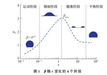 根據(jù)β隨τ變化情況,液滴碰撞分為運(yùn)動、鋪展、弛豫和平衡4個階段,如圖1所示。在運(yùn)動階段(τ<0.1),慣性力占主導(dǎo)地位,液滴上部仍保持球狀,下部鋪展成楔形邊緣,文指出該階段可忽略流體性質(zhì)影響,β隨τ呈指數(shù)上升,即β∝τb,其中指數(shù)b介于0.45到0.57之間,一般取b=0.5;在鋪展階段,受黏性力或毛細(xì)力的主導(dǎo)作用,β逐漸增至βmax,然后液滴開始回撤收縮,進(jìn)入馳豫階段;在平衡階段,液滴可能穩(wěn)定鋪展,也可能發(fā)生反彈,或者碎裂飛濺。本文主要針對運(yùn)動階段和鋪展階段進(jìn)行研究。