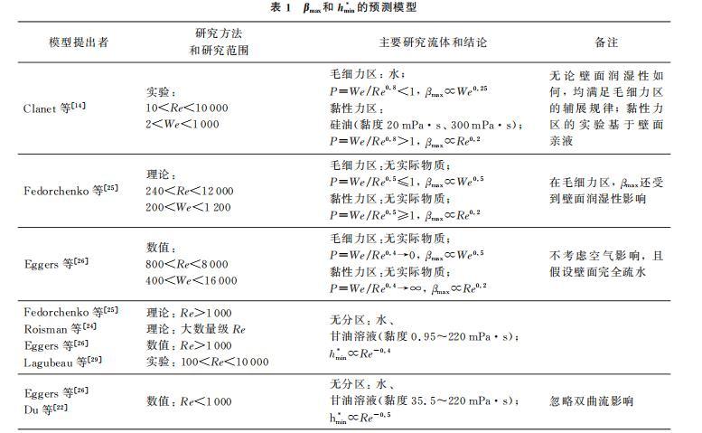 βmax和hmin*的多種預(yù)測模型如表1所示。從表1可以看出,在黏性力區(qū),已有的理論、實(shí)驗(yàn)和模擬研究普遍認(rèn)為βmax主要由Re控制,與Re0.2成正比,但目前實(shí)驗(yàn)數(shù)據(jù)和模擬驗(yàn)證均較少,已有實(shí)驗(yàn)主要針對硅油、甘油溶液,黏度在300 mPa·s以內(nèi),缺乏對于更高黏度液體的研究;另外,Eggers等的模擬研究不針對真實(shí)流體,且忽略空氣影響和假設(shè)壁面完全疏水,與現(xiàn)實(shí)情況具有差異。在毛細(xì)力區(qū),盡管Eggers等的模擬結(jié)果與Fedorchenko等的理論相符合,都認(rèn)為βmax∝We0.5,但Clanet等的實(shí)驗(yàn)結(jié)果卻表明βmax∝We0.25,實(shí)驗(yàn)所得We指數(shù)大小僅為理論的一半。因此,仍需對βmax進(jìn)行更多的實(shí)驗(yàn)、模擬研究。