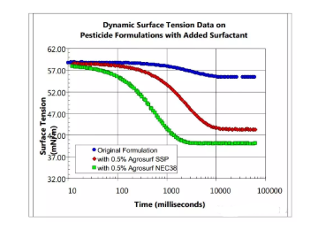 我們分別用KRüSS的BP100動(dòng)態(tài)表面張力儀,DSA100液滴形狀分析儀,從動(dòng)態(tài)表面張力,接觸角和滾動(dòng)角的角度,來(lái)全面衡量和評(píng)價(jià)0.5wt%的Agrosurf SSP、0.5wt%的Agrosurf NEC38對(duì)農(nóng)藥的噴灑效果。