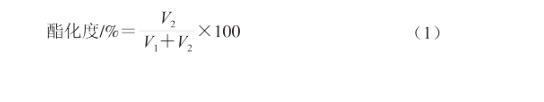 稱取100 mg不同脫酯果膠溶解于30 mL去離子水中,攪拌過夜。滴定前向果膠溶液中滴加3滴酚酞作為指示劑,用0.1 mol/L氫氧化鈉滴定液將果膠溶液滴定至顏色變?yōu)榉奂t色,記錄消耗的滴定液體積V1。向體系中加入10 mL 0.1 mol/L氫氧化鈉溶液,脫酯15 min后,再加入10 mL 0.1 mol/L鹽酸溶液。然后用0.1 mol/L氫氧化鈉滴定液滴定體系中過量的鹽酸,直至顏色變?yōu)榉奂t色,記錄滴定液消耗量(V2)。按式(1)計(jì)算果膠酯化度: