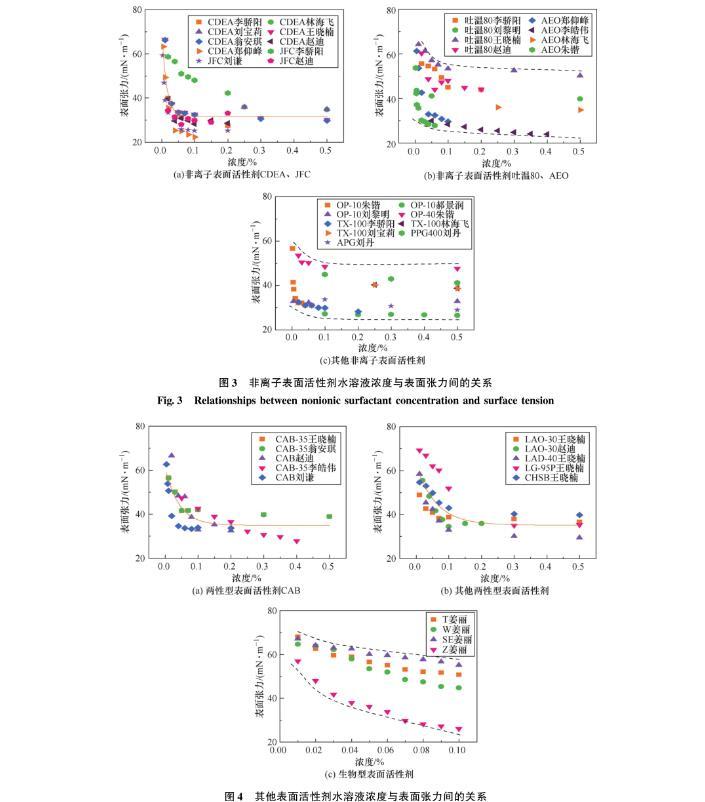 采用文獻調(diào)查法,匯總分析了82組不同類型表面活性劑水溶液濃度與表面張力的對應關系[19-34],如圖1~圖4所示。