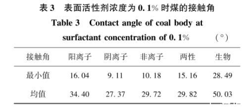 以接觸角作為判斷潤濕的標準,接觸角越小則潤濕性能越好。表面活性劑濃度為0.1%時,煤巖接觸角統(tǒng)計結(jié)果見表3。當活性劑水溶液濃度為0.1%時,陰離子表面活性劑AES水溶液與煤的接觸角最小為9.11°。進一步將不同類型表面活性劑水溶液在濃度為0.1%時與煤的接觸角進行均值化處理可發(fā)現(xiàn),陽離子、陰離子、非離子、兩性及生物表面活性劑水溶液與煤的接觸角平均值分別為34.4°、27.37°、29.72°、29.82°和50.03°。因此,表面活性劑潤濕性效果排序為:陰離子表面活性劑>非離子表面活性劑>兩性表面活性劑>陽離子表面活性劑>生物表面活性劑。