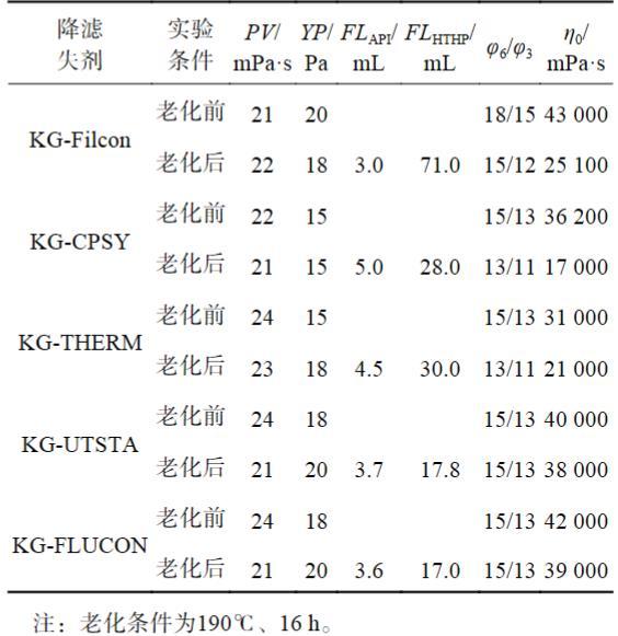 為避免超高溫下材料間的相互影響干擾判斷,室內(nèi)在190℃下先固定KG-TNJ作為增黏劑材料不變,對5種改性淀粉類高溫降濾失劑材料進(jìn)行了初選。其中,KG-Filcon為海上常用抗高溫改性淀粉;KG-CPSY和KG-THERM均為聚合物接枝改性抗高溫淀粉;KG-UTSTA和KG-FLUCON均為室內(nèi)使用2-丙烯酰胺基-2-甲基丙磺酸AMPS、聚苯乙烯乳液與可溶性淀粉在堿性條件下通過接枝共聚生成抗超高溫改性淀粉,2者區(qū)別在于KG-UTSTA為機(jī)械攪拌條件下共聚合成,KG-FLUCON為超聲波機(jī)械協(xié)同方式混勻后再進(jìn)行合成。評價(jià)配方:基礎(chǔ)配方+1.0%KG-TNJ+2.5%降濾失劑,實(shí)驗(yàn)結(jié)果見表2。由表2可知,190℃老化后,各體系的流變性能穩(wěn)定,KG-UTSTA和KG-FLUCON體系的高溫高壓降濾失性最好,濾失量小于20 mL,KG-CPSY和KG-THERM體系的高溫高壓降濾失性能次之。分析原因?yàn)楦男缘矸鄱家肓丝垢邷亟又簿蹎误w,但是KG-FLUCON、KG-UTSTA除了引入AMPS類抗高溫單體外,還引入聚苯乙烯乳液,增加了接枝改性的抗高溫基團(tuán)和空間結(jié)構(gòu),通過聚苯乙烯乳液組分的吸附、滲透、覆蓋包裹特性增強(qiáng)了對淀粉結(jié)構(gòu)的高溫保護(hù)作用和產(chǎn)物的成膜封堵性能,改善了其抗高溫性和濾失造壁。
