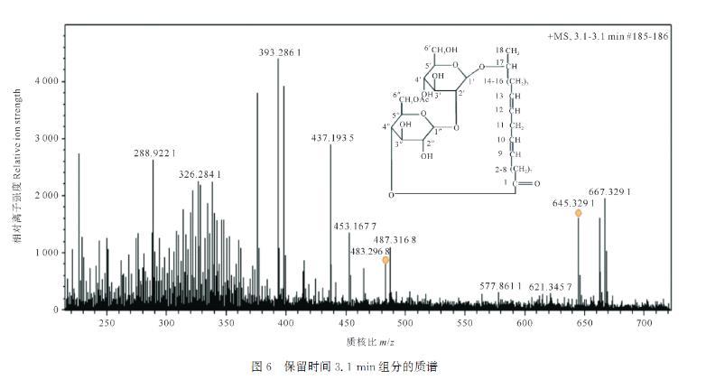 保留時間為3.1 min時色譜峰豐度最高。對該物質(zhì)進(jìn)行詳細(xì)分析,質(zhì)荷比(m/z)645.32的碎片為單乙?;〈膬?nèi)酯型槐糖脂的分子離子峰,m/z 667.32為[M+Na]+峰,m/z 483.29為[M+H-C8H12O6]+峰,其中C8H12O6為乙?;〈黔h(huán)。上述分析表明此物質(zhì)為內(nèi)酯型槐糖脂,具體名稱為:17-L-[(2'-O-β-D-吡喃葡萄糖基-β-D-吡喃葡萄糖基)-O-]十八二烯酸-1',4″-內(nèi)酯-6″乙酸酯。
