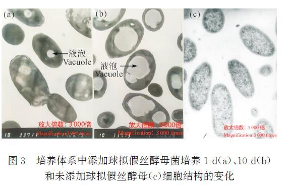 圖3培養(yǎng)體系中添加球擬假絲酵母菌培養(yǎng)1d(a)、10d(b)和未添加球擬假絲酵母(c)細(xì)胞結(jié)構(gòu)的變化