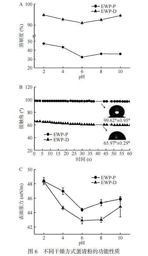 溶解性是蛋白重要的功能特性之一,與接觸角、表面張力、乳化性等密切相關。如圖6A,不同pH下不同干燥方式的蛋清粉溶解度的測量。EWP-P的溶解度隨著pH的升高先減小后增大,這可能是因為在酸性和堿性環(huán)境中球狀蛋白質會發(fā)生部分展開,形成熔融球狀構象,變得更加靈活,更容易與水分子作用。pH為6.0時蛋清蛋白的溶解度最低,可能是因為該pH與蛋清蛋白中大部分蛋白的等電點相近,蛋白帶電荷量較少,因此容易發(fā)生沉淀。與EWP-P相比,EWP-D在pH6.0時溶解度的下降程度較小,這可能與真空冷凍干燥后蛋清蛋白的微觀結構呈片狀,具有較大的比表面積有關,也可能是因為冷凍干燥蛋白質在脫水過程中蛋白質變性低,促進了可溶性聚集物生成。EWP-D的溶解度遠大于EWP-P,這是因為噴霧干燥是直接將蛋清液霧化后再干燥,其蛋清粉表面會形成一個光滑、抗?jié)裥缘谋∧?,最終導致蛋白的溶解性降低,復水性差且易結塊。而真空冷凍干燥經(jīng)過冷凍升華,可保持食品原有的形狀故具有很好的速溶性和復水性。Shaviklo等也發(fā)現(xiàn)噴霧干燥的含添加劑(花粉)蛋白的蛋白質溶解度明顯低于凍干蛋白。