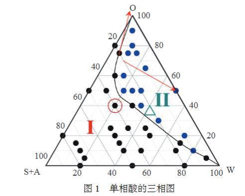 通過擬三元相圖制備單相酸相圖,根據(jù)油相(O)、酸相(W)、表面活性劑(S)+助表面活性劑(A)的比例進行三相圖的繪制。室溫下,固定油相(O)的加量,固定非離子表面活性劑(S1)與陽離子表面活性劑(S2)的質(zhì)量比,固定表面活性劑(S,S=S1+S2)與助表面活性劑(A)的質(zhì)量比。將不同比例下的液體進行離心,然后進行觀測,觀察體系由澄清透明(一相)變?yōu)榛鞚幔ǘ啵┑南嘧冞^程,在每次發(fā)生相變的同時記錄所滴加鹽酸的量,以O(shè)、S+A、W為三相,繪制擬三元相圖,見圖1。由圖1可知,在圖1的紅圈標記區(qū)域,配方的經(jīng)濟性最好,是維持單相區(qū)域最小的表面活性劑用量(S+A),且該配方下的單相酸遇水遇油后仍可在較大范圍內(nèi)保持單相。