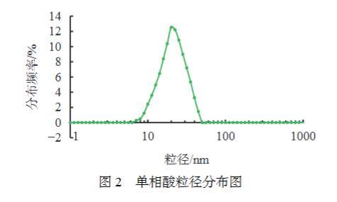 采用激光粒度分析儀對單相酸粒徑及分布進行了測定,實驗結(jié)果見圖2??芍獑蜗嗨崃酱笮》植荚?~50 nm范圍之內(nèi),分布較窄,為高斯分布,在單相微乳粒徑范圍內(nèi)。