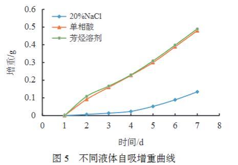 設(shè)置不同液體進行自吸實驗,對比親油巖心對于不同液體的自吸能力,實驗結(jié)果見圖5。對孔隙介質(zhì)而言,潤濕性控制兩相或多相流體的分布和流動。平衡時濕潤相與孔隙表面相互接觸,而非濕相占據(jù)孔隙的中央位置,介質(zhì)中發(fā)生兩相或多相流動時,毛管力與濕相流動方向一致,是非濕相自發(fā)進入巖心介質(zhì)驅(qū)替潤濕相的阻力,對于油濕巖心介質(zhì),很難發(fā)生水的自吸。從實驗結(jié)果可以看出,單相酸自吸效果和芳烴溶劑十分接近。