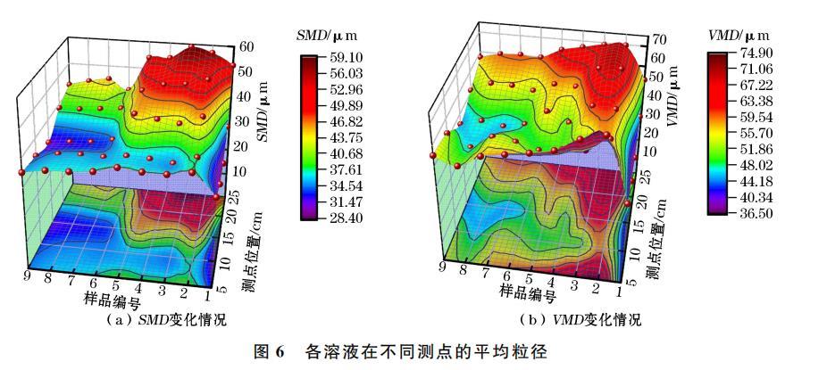 在噴霧形成過程中,空氣動力相同時,表面張力對霧滴破碎的阻礙作用決定粒徑分布情況,所以表面張力減小,溶液可分裂成無數(shù)尺寸細(xì)小的霧滴,其粒徑隨之細(xì)化。霧化是液體射出噴嘴后,受噴霧壓力作用不斷破碎呈霧滴的過程,因此礦井水表面張力減小后,霧滴破碎受到的抑制力減弱,霧化過程適量延長,霧化區(qū)范圍隨之增大。隨著液體不斷分裂破碎,霧滴粒徑逐漸集中分布于某區(qū)間,各霧滴之間趨向均一化分布。