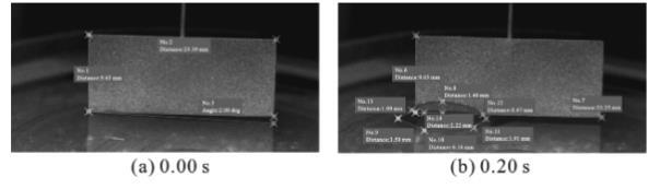 以鉑金板浸入至1%和25%氨水溶液的瞬時浸潤過程為例(見圖1、圖2),鉑金板底部與水平液面存在一定角度,經(jīng)HAS-Xviewer Ver軟件校準(zhǔn)測量,鉑金板浸入1%和25%氨水溶液過程中鉑金板底部與其倒影夾角分別為2.08,1.37°。