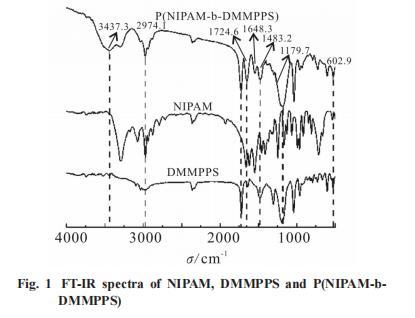 對(duì)單體NIPAM,DMMPPS及共聚物P(NIPAM-b-DMMPPS)進(jìn)行紅外表征,結(jié)果如Fig.1所示。通過對(duì)比分析可以看出,P(NIPAM-b-DMMPPS)紅外譜圖中,3437cm-1為PNIPAM鏈段酰胺基中仲胺N-H的伸縮振動(dòng)吸收峰,2974cm-1為飽和C-H伸縮振動(dòng)吸收峰,1724cm-是PNIPAM鏈段中羰羰基C=O的伸縮振動(dòng)吸收峰,1648cm-1的吸收峰為O-C=O的伸縮振動(dòng)峰,1483cm-1為飽和一CH2一的伸縮振動(dòng)峰,1179cm-1是PDMMPPS鏈段中S=O鍵的吸收峰,603 cm-1為C一Br的振動(dòng)峰。紅外光譜結(jié)果分析表明,此共聚物由單體NIPAM,DMMPPS合成為預(yù)期的目標(biāo)產(chǎn)物。