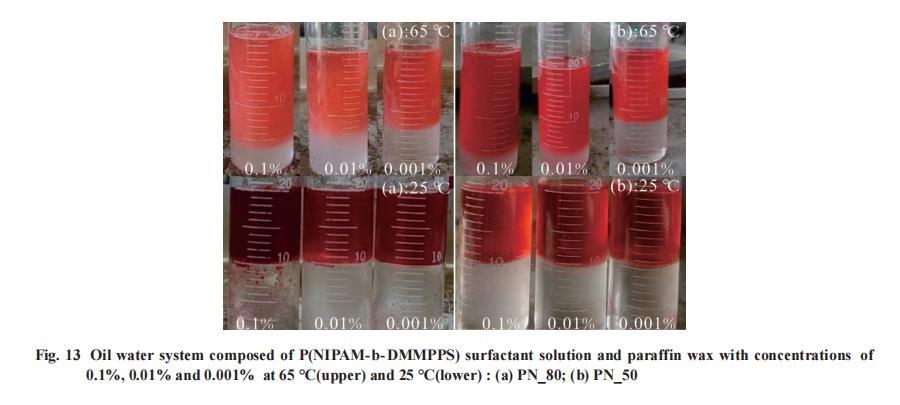 用PN_80進(jìn)行乳化性能測(cè)試符合上述溫度響應(yīng)機(jī)理。油水體系中,質(zhì)量分?jǐn)?shù)為0.1%的PN_80溶液能夠在高溫形成乳液,在溫度降低至25℃時(shí)破乳,如Fig.15所示。此嵌段聚合物L(fēng)CST在36°C左右,低溫時(shí)PDMMPPS鏈段疏水收縮,PNIPAM鏈段親水舒展,聚合物整體表現(xiàn)為親水性;當(dāng)溫度升高至65℃,PDMMPPS鏈段親水舒展,PNIPAM鏈段疏水收縮,聚合物整體表現(xiàn)疏水性。