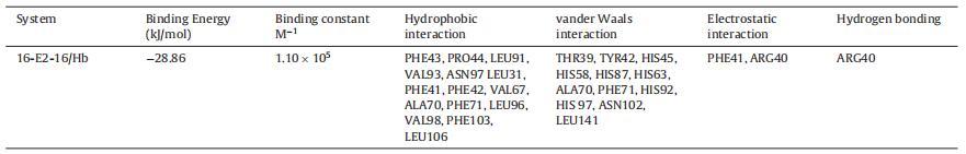 Hb 中的 α 和 β 鏈具有相似的結(jié)構(gòu)折疊, 由七個(gè)連續(xù)的α-螺旋和兩條鏈組成 包含由螺旋 4 和 5 包圍的間隙結(jié)合袋,而空腔的底部由 C 端部分形成 螺旋 6 和螺旋 7 的 N 端片段 [69]。 16-E2-16為主 Hb 與中央空腔、α1 和 β2 鏈結(jié)合(圖 6A)。 這 該結(jié)合位點(diǎn)上的氨基酸殘基包括 Thr39, α1 中的 Tyr42、Phe43、Pro44、His45、His58、His87、Leu91、Val93、Asn97 鏈和 Leu31、Arg40、Phe41、Phe42、His63、Val67、Ala70、Phe71、 His92, Leu96, His 97, Val98, Asn102, Phe103, Leu106, Leu141 in β2 鏈圖 6B。 有超過(guò) 20 個(gè)氨基酸殘基位于 16-E2-16 的站點(diǎn),這意味著它們之間的強(qiáng)相互作用 16-E2-16 和 Hb [70]。 疏水性和靜電力作用 在 16-E2-16 與 Hb 的結(jié)合中起重要作用,這個(gè)結(jié)果是 與我們的實(shí)驗(yàn)結(jié)果一致。 然而,范德瓦爾斯 力量不容忽視。 已觀察到一個(gè)氫鍵 在 16-E2-16/Hb 相互作用中的 16-E2-O 原子 具有 β2 鏈 ARG40 的 16 個(gè)分子(圖 6C)。 的形成 氫鍵穩(wěn)定 16-E2-16/Hb 復(fù)合物。 的類型 相互作用和參與相互作用的氨基酸殘基 以表格形式顯示(表 3)。