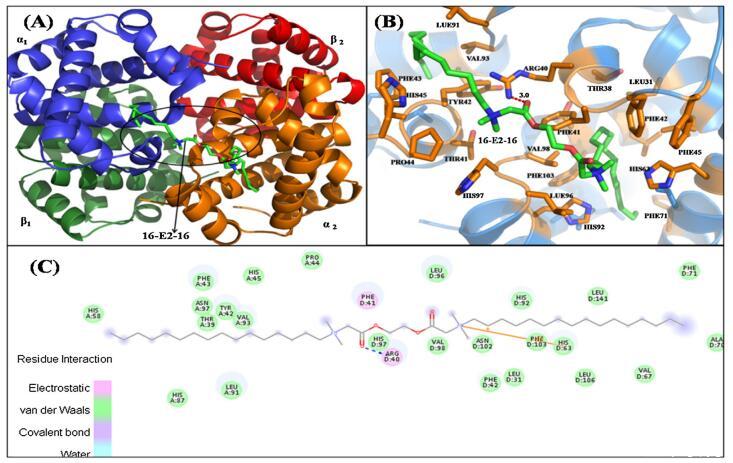 圖 6. 具有 16-E2-16 的 Hb 結(jié)構(gòu)示意圖。 (A) Hb-16-E2-16 的結(jié)構(gòu)。 Hb 的亞單位用不同的顏色表示。 配體 16-E2-16 是 以棍子為代表。 (B) 距??康?16-E2-16(綠色)5? 范圍內(nèi) Hb 的周圍氨基酸殘基(橙色)。 (C) Hb/16-E2-16 相互作用的二維表示。 (為了 對(duì)圖例中顏色參考的解釋,讀者可參考本文的網(wǎng)絡(luò)版本。)