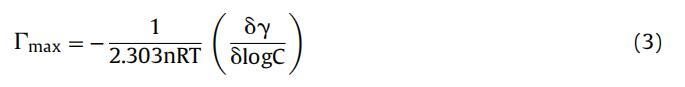 最大表面過(guò)量 (∫max) 表示為每單位面積界面處的表面活性劑分子濃度。 表面張力數(shù)據(jù)用于計(jì)算表面過(guò)量 應(yīng)用吉布斯吸附等溫線的濃度 (∫max) 方程: