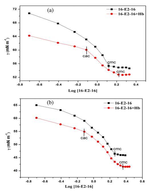 表面張力測(cè)量用于研究 關(guān)于 16-E2-16/Hb 相互作用的定性信息 空氣/水界面。 圖 1 顯示了 16-E2-16 分布的表面張力與對(duì)數(shù)濃度在不存在和 在不同溫度下存在 Hb (5 μM)。 斷點(diǎn) 表面張力與表面活性劑濃度對(duì)數(shù)的關(guān)系 不同溫度下純表面活性劑的文件對(duì)應(yīng) 到相應(yīng)溫度下表面活性劑的 cmc。 這 16-E2-16/Hb體系的表面張力曲線呈現(xiàn)兩個(gè)斷裂 點(diǎn),第一個(gè)斷點(diǎn)對(duì)應(yīng)臨界聚合 濃度(cac)代表表面活性劑的開(kāi)始 蛋白質(zhì)結(jié)合而作為第二個(gè)斷點(diǎn)對(duì)應(yīng)于 在 Hb 存在下 16-E2-16 的 cmc。 16-E2-16 的 cmc 在不同溫度下不存在和存在 Hb 的情況下 列在表 1 中。從這些值可以看出,16-E2-16 的 cmc 隨著 Hb 的存在和溫度升高而增加。 在 Hb 存在下 cmc 的增加證實(shí)了 16-E2-16/Hb 復(fù)合物的形成,在此期間一些單體 與 Hb 結(jié)合,因此無(wú)法形成膠束 進(jìn)而導(dǎo)致膠束化延遲 [54]。 表1還 表明 cmc 值隨溫度升高而增加 這意味著疏水力的參與,它們是 溫度依賴,在 cmc 的蛋白質(zhì)表面活性劑相互作用中。 這可以歸因于 16-E2-的溶解度增加 16 單體隨溫度變化而抑制膠束化。 此外,較高的溫度有利于熱運(yùn)動(dòng),這會(huì)導(dǎo)致 更多的分子與 Hb 結(jié)合。 但是,cac 保持不變 在所有溫度下。 因此,我們可以認(rèn)為 16-E2-16 與 Hb 結(jié)合 通過(guò) cac 附近的靜電相互作用,因?yàn)殪o電 相互作用不受溫度影響。 此后,作為 表面活性劑濃度增加,蛋白質(zhì)通過(guò)疏水力與表面活性劑相互作用。 下表面張力值 Hb-16-E2-16系統(tǒng)比對(duì)應(yīng)的16-E2-16系統(tǒng)是 由于 Hb 的高表面活性。