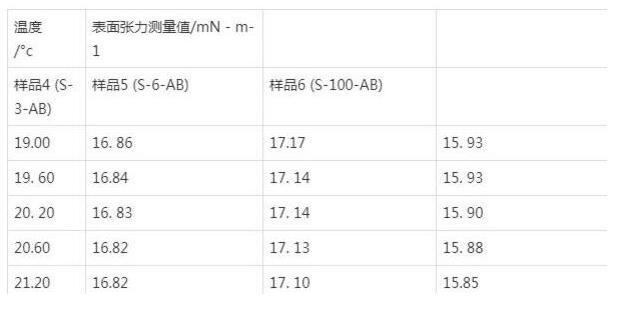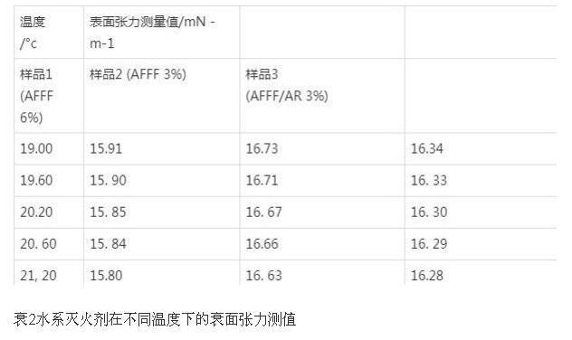 溫度條件對于液體表面張力存在著很大的影響。大量試驗(yàn)數(shù)據(jù)表明,液體的表面張力會隨著溫度的升高而降低。通過對一系列流體滅火劑產(chǎn)品,包括不同配比的泡沫滅火劑(成膜型)、水系滅火劑等樣品進(jìn)行測試,可以清晰地從表1、表2中看出,溫度的變化對流體型滅火剤的表面張力存在一定程度的影響。