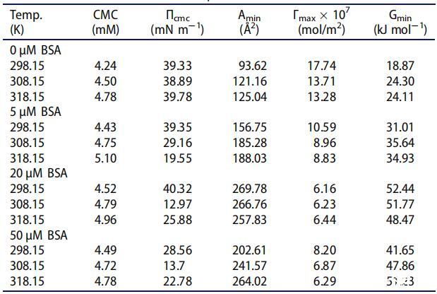 表1.[C10-4-C10im]Br2在不同溫度下存在不同濃度BSA時(shí)的界面參數(shù)。