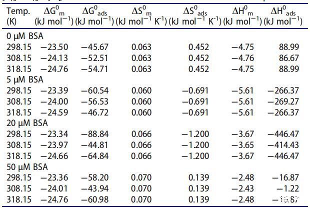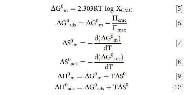 計(jì)算了在不同濃度和溫度下[C10-4-C10im]Br2在不存在和存在BSA的情況下的膠束化和吸附熱力學(xué)參數(shù),以確定溫度和BSA濃度的升高是否有利于膠束化(本體相濃度)或吸附 [C10-4-C10im]Br2的(界面濃度)。使用以下關(guān)系式計(jì)算各種熱力學(xué)參數(shù)。[79]