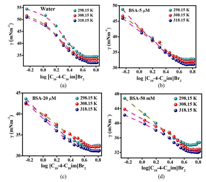 圖2. 在含有(a)0(b)5,(c)20和(d)50μM BSA的水溶液中,表面張力(γ)與log[C10-4-C10im]Br2的關(guān)系。