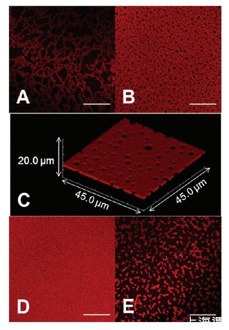 圖2。蛋白質(zhì)組裝的形態(tài),隨離子強度和還原劑的添加而變化。HSATR(0.01 mg/mL)在(A,B)PBS中的AWI下自組裝,pH值7.2,離子強度=53 mM和(C)在掃描體積為45.0*45.0*20.0μm3的情況下,呈現(xiàn)了與圖像B相同的溶液條件對應的共焦圖像Z疊層。(D)PBS,pH值7.2,離子強度=530 mM。(E)30 mM DTT,pH 7.2,離子強度=53 mM的PBS。比例尺:20μm。