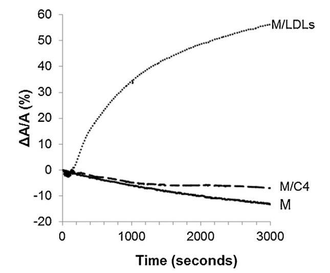 圖4。單層(M)所覆蓋的界面的相對(duì)表面積隨時(shí)間的變化,該單層(M)以25 mN/M的速度壓縮,并在不含任何額外分子(-)的緩沖液上形成,(…)LDL(4.6 mg PC)和(-)脂質(zhì)體C4(含4.8 mg PC)??諝?緩沖界面處的溫度為34℃。