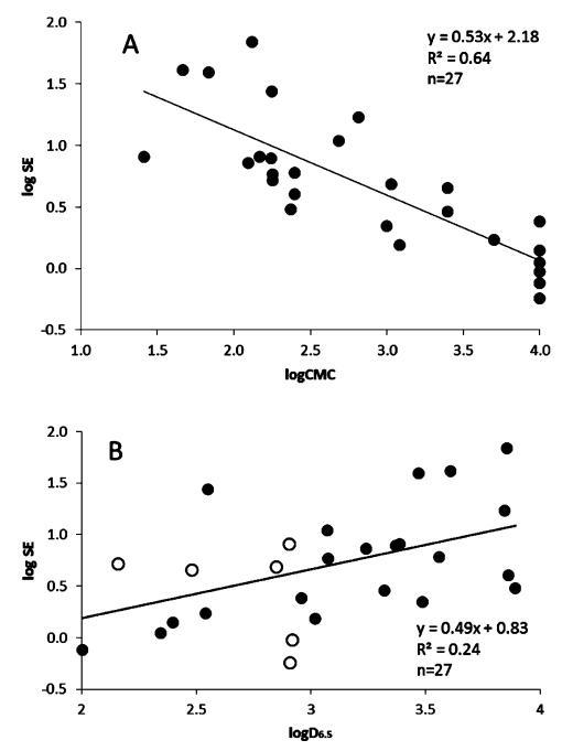 圖5。根據(jù)對數(shù)CMC(μM,A)和pH 6.5下的辛醇分配系數(shù)(logD6.5;B)繪制溶解度增強曲線。數(shù)據(jù)集僅限于顯示logD6的化合物。5個在2到4之間。圖B中的開放圓對應(yīng)于從文獻檢索、預(yù)測或從pH值為7.4的logD推斷的logD值。高于或低于檢測限的值在檢測限處繪制。