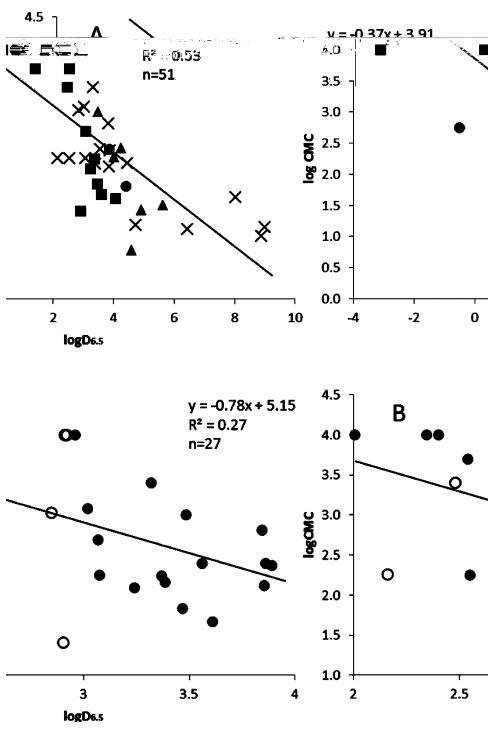 圖6。對于分類為酸的完整化合物組(A),根據(jù)pH 6.5(logD6.5)下的辛醇分配系數(shù)繪制對數(shù)CMC(μM)(■),基地(▲),中性離子(x)和兩性離子(?),以及l(fā)ogd2和logd4(B)范圍內(nèi)的化合物。圖B中的開放圓對應(yīng)于從文獻檢索、預(yù)測或從pH值為7.4的logD推斷的logD值。高于或低于檢測限的值在檢測限處繪制。