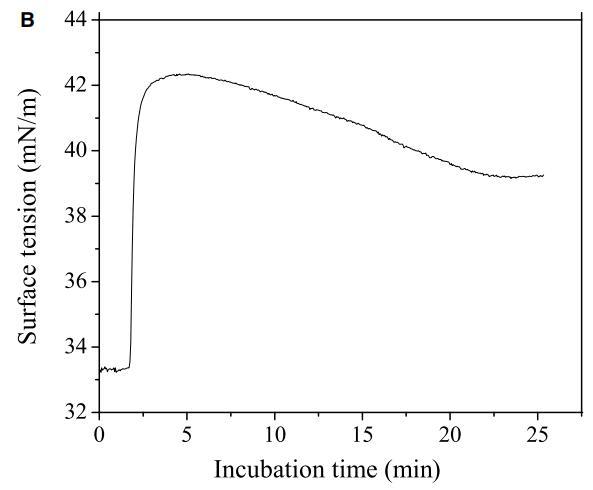 圖5:(A)使用活/死試劑盒測定的肽CL-7誘導(dǎo)A549細(xì)胞膜損傷的動力學(xué)。在不同時間點添加肽溶液后拍攝熒光圖像。計算綠色像素占總綠色和紅色像素的百分比,以估計細(xì)胞膜的完整性。(B)肽CL-7結(jié)合和插入引起脂質(zhì)單層的表面張力變化(DPPC/膽固醇/DPPS=50/10/2.5)。肽濃度保持在10 lM,脂質(zhì)單層的初始表面張力設(shè)定為33 mN/m。