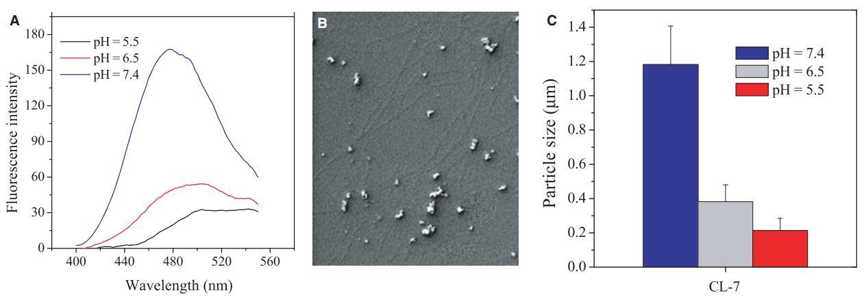 圖6:(A)pH值影響不同pH值下溶液(40 lM)中CL-7的聚集。1-苯胺基萘-8-磺酸(1,8-ANS)濃度固定在20 lM,激發(fā)波長設(shè)置為369 nm。肽聚集溶解通過1,8-ANS發(fā)射峰在500 nm處的紅移和熒光強度降低來指示;(B)pH=7.4的40 lM肽溶液中形成的CL-7聚集體的掃描電子顯微鏡圖像;(C)隔夜培養(yǎng)后測量溶液中肽CL-7(80 lM)的粒徑。數(shù)據(jù)代表至少三個獨立測試的平均值和標(biāo)準(zhǔn)差。
