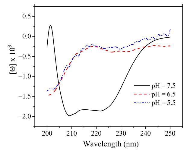 除了肽聚集狀態(tài)外,細(xì)胞表面pH值也可能影響pH敏感肽的二級結(jié)構(gòu)。已經(jīng)發(fā)現(xiàn),肽插入細(xì)胞膜通常伴隨著肽二級結(jié)構(gòu)的變化(17)。肽鏈折疊成特定構(gòu)象,通常為α螺旋結(jié)構(gòu),這被證明是肽插入細(xì)胞膜的必要過程(6)。盡管所有選定的pH敏感裂解肽在生理pH下均采用螺旋結(jié)構(gòu),但當(dāng)環(huán)境pH降至肽的過渡pH以下時,它們變成隨機線圈(表2和圖7)。從無規(guī)螺旋轉(zhuǎn)變?yōu)槁菪请牟迦肽さ哪芰坑欣^程(6)。因此,細(xì)胞表面pH值也可能通過改變pH敏感肽的二級結(jié)構(gòu)而影響其活性。