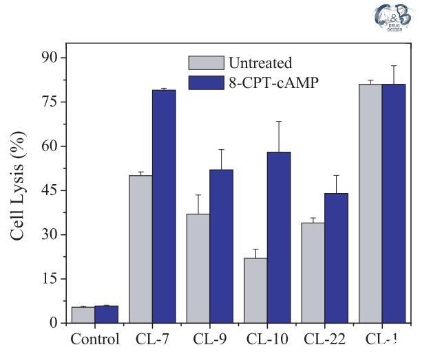 為了排除上述結(jié)果由CHO-K1細(xì)胞的某些固有特性引起的可能性,我們在另一個選定的細(xì)胞A549上進行了相同的實驗,其細(xì)胞表面電荷與CHOK1細(xì)胞幾乎相同(表1)。由于肽將受到來自A549和CHO-K1細(xì)胞的相同拉力,靜電吸引對肽-細(xì)胞相互作用的潛在影響被最小化或消除。A549細(xì)胞的表面pH值為7.15,高于肽CL-9、CL-10和CL-22的過渡pH值,但低于肽CL-7的過渡pH值(pH值為7.35)。同樣,CL-7被證明是A549細(xì)胞上最活躍的肽(圖3)。在存在8-CPT-cAMP的情況下,A549細(xì)胞的表面pH值降低至pH=6.55(表3),低于所有受試裂解肽的過渡pH值(表1)。因此,四種pH敏感裂解肽對8-CPTcAMP處理的A549細(xì)胞的裂解活性顯著增加(圖3)。應(yīng)注意的是,與pH敏感肽不同,當(dāng)細(xì)胞被8-CPT-cAMP處理時,pH不敏感肽CL-1對A549和CHO-K1細(xì)胞的活性幾乎沒有變化(圖2和圖3)。