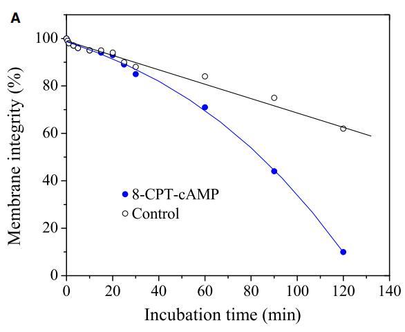 肽與細(xì)胞膜的相互作用包括三個步驟:(i)陽離子肽對細(xì)胞表面的靜電吸引;(ii)肽向結(jié)合平面的轉(zhuǎn)變;(iii)將肽插入細(xì)胞膜。通過研究pH敏感肽CL-7誘導(dǎo)的膜損傷動力學(xué),研究了肽-細(xì)胞相互作用的細(xì)節(jié)(圖5A)。CL-7誘導(dǎo)的A549細(xì)胞膜滲漏呈時間依賴性,并呈線性曲線。盡管在8-CPT-cAMP處理的A549細(xì)胞上,CL-7介導(dǎo)的細(xì)胞膜損傷在開始時遵循相同的曲線,但它偏離了線性曲線,并在培養(yǎng)15-20分鐘后加速(圖5A)。在脂質(zhì)單層膜上進行的平行膜張力研究表明,CL-7與細(xì)胞膜的相互作用以表面張力快速增加的初始階段為特征,隨后是表面張力松弛的第二階段(圖5B),與肽與膜結(jié)合和肽插入相關(guān)膜,分別。盡管CL-7與脂膜結(jié)合是一個快速過程(3-5分鐘),但肽插入脂膜大約需要20分鐘才能完成。這兩個實驗的結(jié)果非常吻合,這意味著細(xì)胞表面pH對CL-7的顯著影響發(fā)生在肽-細(xì)胞相互作用的后期,即肽插入細(xì)胞膜。