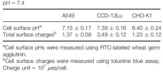 雖然細(xì)胞外環(huán)境通過影響細(xì)胞表面和整體溶液之間的質(zhì)子交換而影響細(xì)胞表面pH值,但在pH值固定的生理條件下,細(xì)胞表面pH值將由細(xì)胞的化學(xué)和生物學(xué)特性決定,包括細(xì)胞的質(zhì)子生產(chǎn)能力、細(xì)胞大小、細(xì)胞的大小、細(xì)胞的大小、細(xì)胞的大小、細(xì)胞的大小、細(xì)胞的大小、細(xì)胞的大小、細(xì)胞的大小、細(xì)胞的大小以及細(xì)胞的大小,以及細(xì)胞表面的pH緩沖能力。因此,在生理條件下,組織細(xì)胞可能具有特定的甚至可區(qū)分的表面pHs。我們測量了一組來自不同器官/組織的細(xì)胞在生理pH下的細(xì)胞表面pH值,發(fā)現(xiàn)所有受試細(xì)胞都具有不同的表面pH值(表1)。