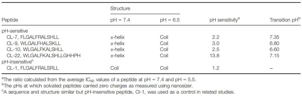 肽CL-1是一種pH不敏感的裂解肽(表2)。盡管其序列和結(jié)構(gòu)與其他pH敏感肽相似,但其細(xì)胞裂解活性幾乎不受pH的影響。本研究以肽CL-1作為陰性對照。