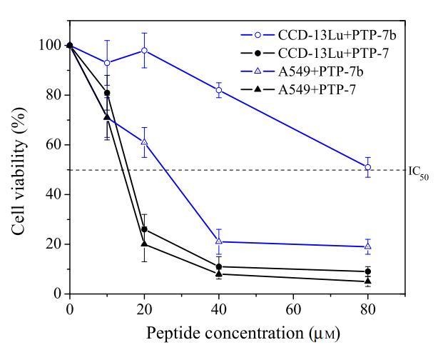 在細(xì)胞毒性研究中,選擇了研究充分的pH敏感裂解肽PTP-7b(FLGALFKALSHL)(6,9)。由于PTP-7b的過渡pH(pH=7.25)低于A549的表面pH,但高于CCD-13Lu,因此裂解肽PTP-7b對A549的毒性可能比對CCD-13Lu細(xì)胞的毒性更大。選擇PTP-7b的親本肽PTP-7(FLGALFKALSKLL),一種pH不敏感的裂解肽(6,9)作為對照。如圖8所示,盡管肽PTP-7對兩種細(xì)胞的活性相同,但pH敏感肽PTP-7b對A549的毒性大約是對CCD-13Lu的三倍。