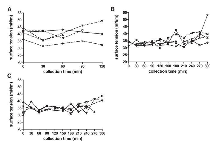 圖6。在禁食(A)、喂食(B)和高脂喂食(C)狀態(tài)下,表面張力(mN/m)隨餐后時間的變化。(--?--)主題1(··?··)主題2,(·–·)△·–·)主題3,(·-·▽·–·)主題4,(-◇–)科目5。